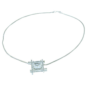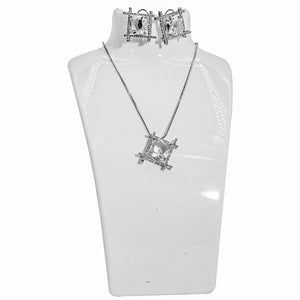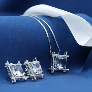 This captivating jewelry set features a pendant and matching earrings, each showcasing a unique square design with a central rectangular white gemstone. The gemstones are framed by a delicate border of sparkling clear crystals, adding a touch of brilliance and sophistication. The silver-tone finish enhances the overall elegance of the set.