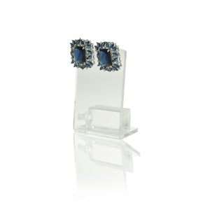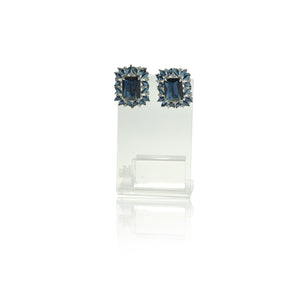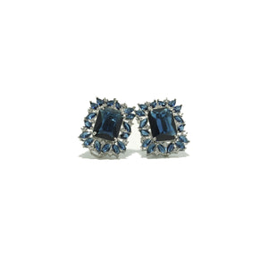 These stunning earrings are a true display of sophistication, featuring a rectangular-cut dark blue gemstone at their center, surrounded by a sparkling halo of clear cubic zirconia stones. The elegant design is further enhanced by the addition of smaller blue gemstones, creating a luxurious and radiant effect. The silver-tone setting beautifully complements the deep, rich blue hues of the gemstones, making these earrings perfect for both elegant events and everyday wear.
