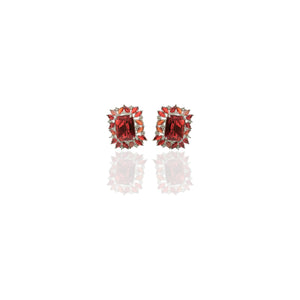 These stunning earrings are a true display of sophistication, featuring a rectangular-cut dark red gemstone at their center, surrounded by a sparkling halo of clear cubic zirconia stones. The elegant design is further enhanced by the addition of smaller red gemstones, creating a luxurious and radiant effect. The silver-tone setting beautifully complements the deep, rich red hues of the gemstones, making these earrings perfect for both elegant events and everyday wear.