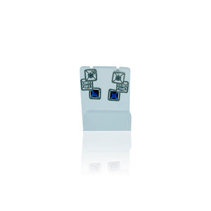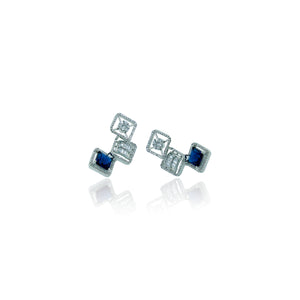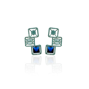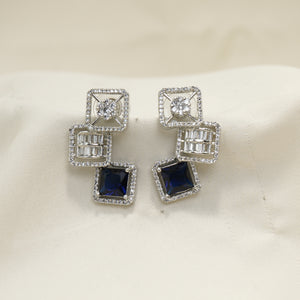 These stunning earrings feature a unique, multi-layered design with a combination of square and rectangular elements. Each earring showcases a deep blue square-cut gemstone at the bottom, complemented by intricately designed silver-tone layers above. The top layers are adorned with clear stones, adding a touch of sparkle and sophistication. The overall design is both modern and elegant, making these earrings perfect for special occasions and formal events.