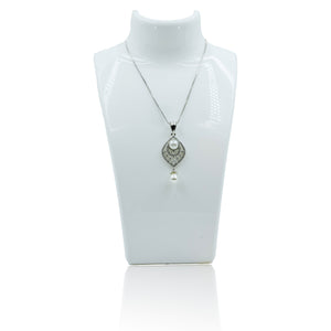 This exquisite pendant features a stunning leaf-shaped design, adorned with lustrous pearls and sparkling crystals. The intricate filigree work adds a touch of vintage elegance, while the pearl drop enhances the overall charm. Perfect for both casual and formal occasions, this pendant is sure to add a touch of sophistication to any outfit.