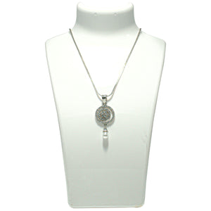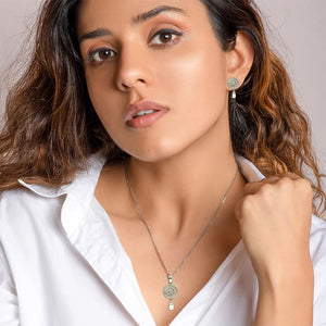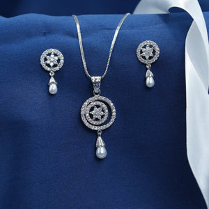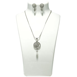 This exquisite jewelry set includes a pendant and matching earrings, each featuring an intricate circular design embellished with shimmering clear stones and a single dangling pearl. The detailed metal work forms a captivating, web-like pattern that elegantly showcases the pearls, The meticulous craftsmanship ensures longevity and a refined look, making this set a cherished one.