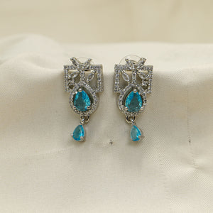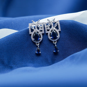 These stunning earrings feature a captivating teardrop-shaped blue gemstone, exuding elegance and sophistication. Each earring is crafted with a vibrant blue gemstone set in a silver-tone frame, adorned with a halo of sparkling cubic zirconia stones that enhance the gemstone's natural beauty. The teardrop shape adds a touch of grace and allure, making these earrings perfect for both formal and casual occasions.