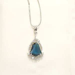 This exquisite pendant features a mesmerizing teardrop-shaped blue gemstone, its lush, verdant hue exuding timeless charm. The centerpiece is gracefully surrounded by a delicate arrangement of shimmering accents, designed to draw the eye and elevate its brilliance. Meticulously crafted with an artistic touch and the finest materials, this pendant is more than jewelry—it's a celebration of elegance, perfectly suited to complement your most cherished moments.