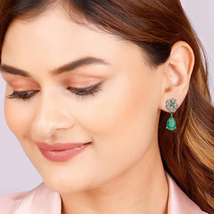 These enchanting earrings feature teardrop-cut emerald gemstones set in a delicate silver-tone frame, complemented by intricate floral designs. The emeralds exhibit a rich, vibrant green hue, while the floral accents add a touch of elegance and sophistication. The drop design allows the emeralds to gracefully dangle, creating a captivating movement. These earrings are perfect for both formal occasions and everyday wear, offering a timeless and elegant look.
