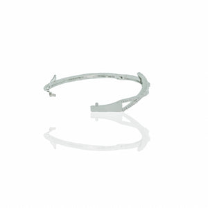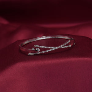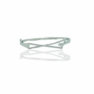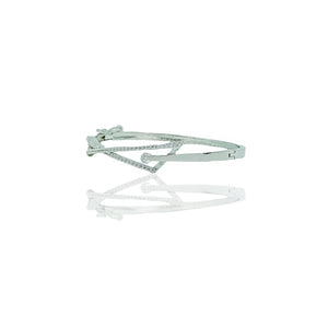 This sophisticated bangle showcases a sleek, contemporary design with a striking geometric twist. Adorned with a shimmering line of delicate crystals, it exudes elegance and refinement. The cool-toned metallic finish enhances its modern aesthetic, while a captivating blue accent nestled within the design adds a subtle pop of color. Ideal for both formal and everyday wear, this bangle is a versatile statement piece