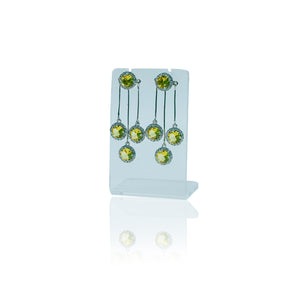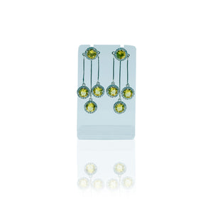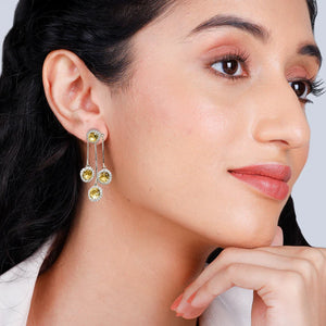 Make a bold statement with these enchanting earrings, showcasing round-cut, vibrant yellow gemstones that radiate warmth and brilliance. Set in a sleek silver-tone frame, the design features a cascading drop arrangement, elegantly highlighting the gemstones’ golden hues. Accented with a circle of radiant stones that amplify their sparkle, these earrings exude timeless sophistication. The striking contrast between the vivid yellow gemstones and the luminous accents ensures a captivating look. Perfect for formal events or special occasions, these earrings bring a touch of radiant luxury and refined elegance to your ensemble.